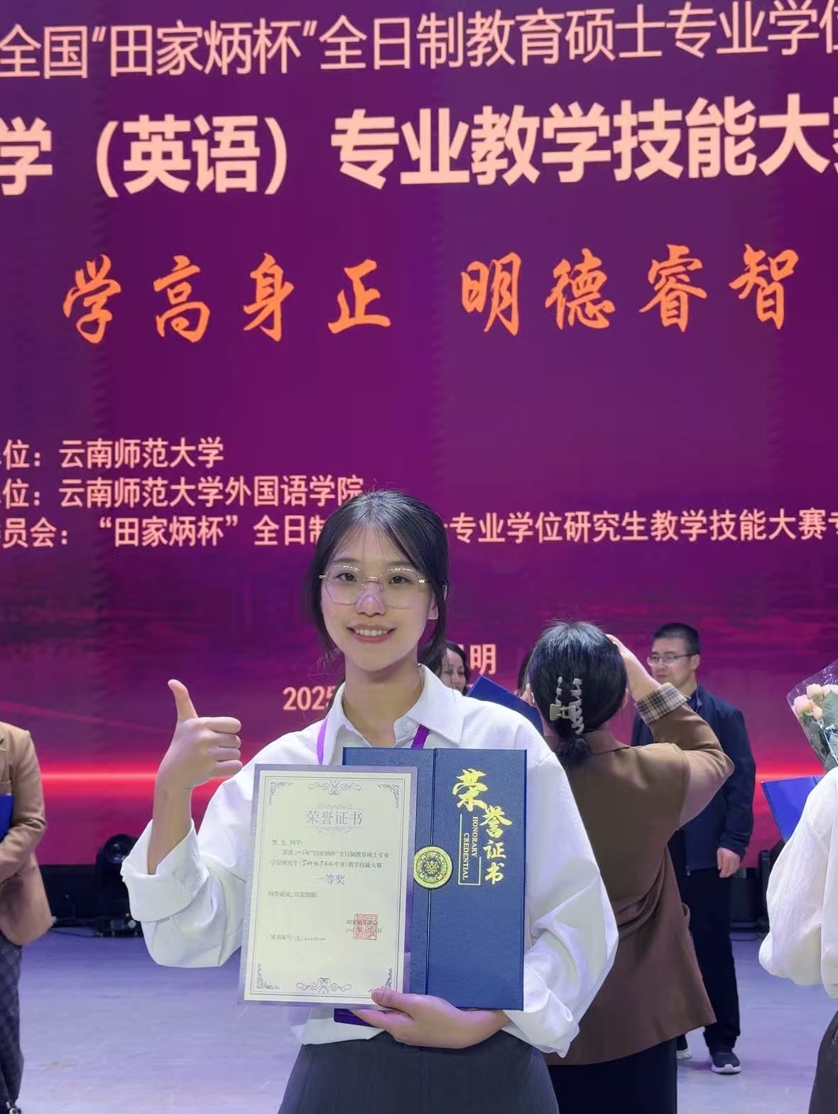 球王会2024级学科教学(英语)专业硕士生该项赛事中取得优异成绩。其中,陈艺获一等奖(指导教师:李丽君),杨梓羚(指导教师:李丽君)、吴海静(指导教师:莫甲凤)获三等奖,李家璇(指导教师:庞青山)获优秀教学设计奖。