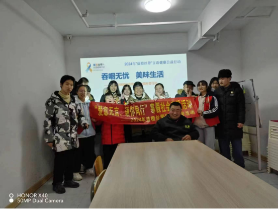 宣讲内容主要分为两部分:吞咽障碍和口吃问题。首先,我们介绍了吞咽障碍的定义、表现、原因、老年人流行病学及不良后果,这有利于更加全面地认识吞咽障碍问题。接下来,团队成员又通过播放PPT和现场讲解的方式详细介绍了口吃的定义、原因、症状和影响。另外针对口吃问题,在宣讲中,康复所的残障人士们了解到了一些缓解口吃问题的方法,比如药物治疗,言语练习等等,而其他听众同样表示我们社会大众也应该对该类人群多一点包容关心和理解,为他们营造一个良好的言语社会环境。