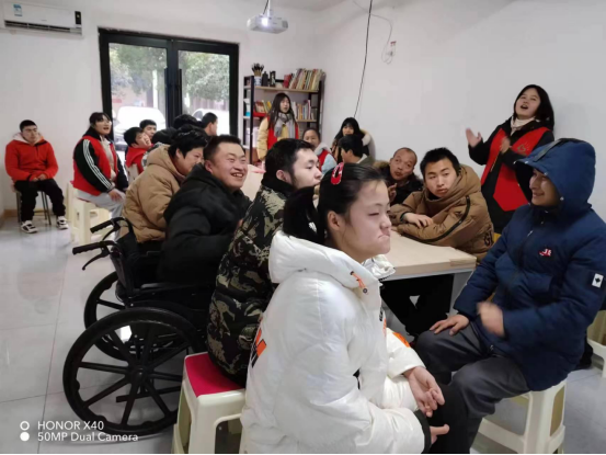在歌唱环节,残障人士敢于放声歌唱,即使存在言语障碍,吐字不清,发音不全的情况,依然自信活泼,陶醉其中。我们带领他们学唱《开心往前飞》,既调动了现场气氛,给他们带来欢乐,也是治疗缓解言语障碍的一种寓教于乐的方式。