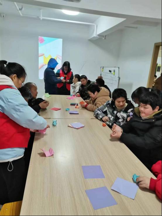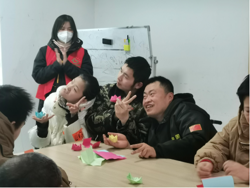 在折纸互动环节中,残障人士们积极参与,脸上带着笑意,跟随着视频讲解和志愿者们的现场展示,一步一步折出好看的皇冠和爱心。折好之后,他们还纷纷表示想和自己的折纸作品拍照纪念。有几位残障人士还把他们亲手完成的折纸作品带回家想送给其亲人朋友们。